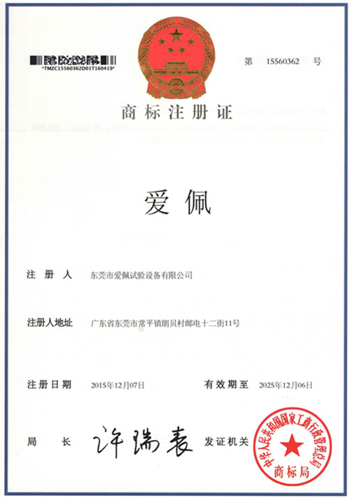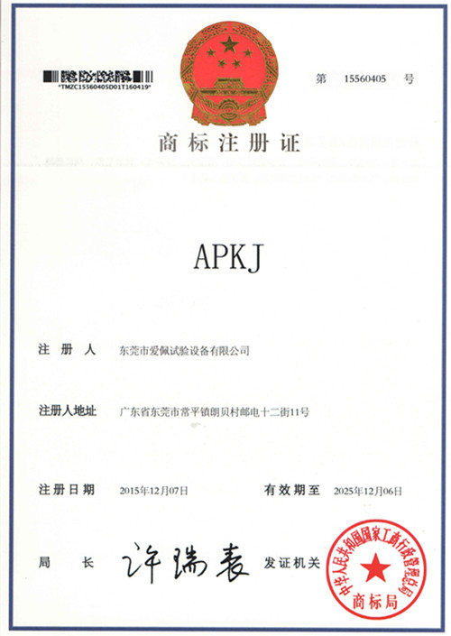 恭喜東莞市愛(ài)佩試驗(yàn)設(shè)備有限公司向中華人民共和國(guó)國(guó)家工商行政管理總局(商標(biāo)局)申請(qǐng)的“愛(ài)佩”“APKJ”商標(biāo)正式通過(guò)并成功注冊(cè),于2016年正式收到商標(biāo)注冊(cè)證原件。