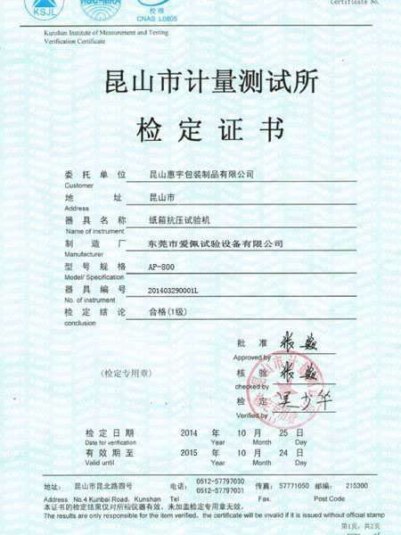 紙箱抗壓檢定證書