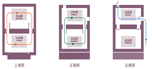 三箱設(shè)備區(qū)分為高溫區(qū)、低溫區(qū)、測試區(qū)三部分,測試樣品完全靜止于測試區(qū)。采用獨(dú)特之蓄熱、蓄冷結(jié)構(gòu),強(qiáng)制冷熱風(fēng)路切換方式導(dǎo)入測試區(qū),沖擊時高溫區(qū)或低溫區(qū)的溫度沖入測試區(qū)進(jìn)行沖擊,完成冷熱溫度沖擊測試。